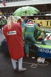 SPAIN. Barcelona. Formula One Women. Angela, the girlfriend of the Jordan driver, Andrea de Cesaris, watches as he checks his car. 1991.