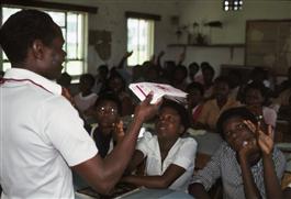 UGANDA. Kalisizo. District Health Education Officer Robert Sangos from the regional health centre, lecturing at the Kings Girl Secondary School. As part of his lecture Dr. Sangos hands out leaflets and condoms. 1987.