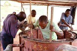 Africa. Rwanda. Nr Cyangugu. Lake Kivu. MSF workers pour concrete into moulds to make the lining pipes for the clean water wells under construction.