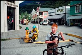 USA. Alaska. Southeastern Alaska. Skagway. A fire fighter couples his hose to a fire hydrant during an emergency while a youngster with his bike ignores the excitement and continues eating his smoothie snack.