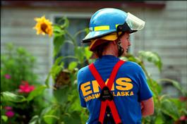 USA. Alaska. Skagway. Woman fire officer attending an incident...