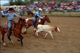 USE. Alaska. South Central Alaska. Palmer. Alaska State Fair 2001. Cowboys competing in the steer-roping contest in the rodeo. Both lassoo the young steer from horseback, one around the neck to stop it, the other around both back legs to begin the three-leg tying which immbolises it.