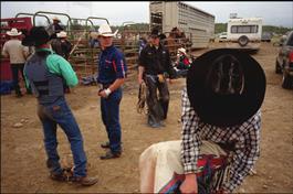 USA. Alaska. South Central Alaska. Palmer. Alaska State Fair 2001. Cowboys tie fancy chaps over their jeans before competing in the rodeo.