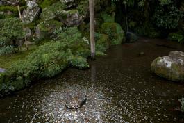 JAPAN. KYOTO. Ginkakuji Temple. World Cultural Heritage site. Coins in pond with waterfall.