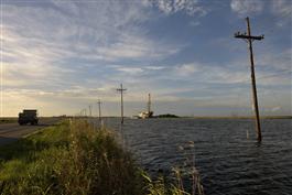 USA. Louisiana. 2010. Oil drilling amongst the marshes near Port Fouchon. Marsh grass is destroyed by oil and use of dispersants.