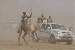 Egypt. Sinai desert. Bedouin tribesmen have entered their camels in a race across 13 kilometres of the desert. The camels and their small boy jockeys have set off, followed by the owners and friends in their 4x4 pick up trucks, driving across the sand.
