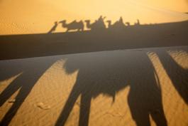 CHINA. INNER MONGOLIA. XIANGSHAWAN Desert Tourist Resort on the edge of the Gobi Desert. Chadows of Bactrian camel riders.