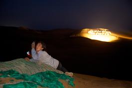 CHINA. INNER MONGOLIA. XIANGSHAWAN Desert Tourist Resort on the edge of the Gobi Desert. Tourist takes a photograph and desert fires in the background,