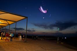 CHINA. INNER MONGOLIA. XIANGSHAWAN Desert Tourist Resort on the edge of the Gobi Desert. Flying illuminated kites in the evening.