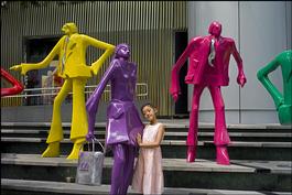 Singapore. A little girl poses against one of the colourful figures on display outside the ION Orchard shopping mall on Orchard Street. 2012