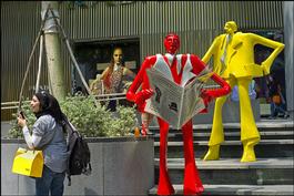 Singapore. A young Muslin woman stops to take a phone call by colourful figures on display outside the ION Orchard shopping mall on Orchard Street. 2012