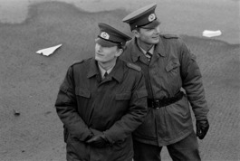 GERMANY. West Berlin. The Fall of the Berlin Wall. East German border guards watch over crowds gathered on top of the Berlin Wall. The day after the opening of the border, November 10th 1989.