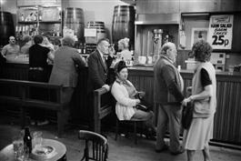 GB. England. Manchester. Oldham Street. Yates's Wine Lodges. Although well priced in comparison to their competitors, these wine lodges acquired a distinctly dismal reputation with typical characteristics of a working class customer, elderly and often female with overdone make-up. But the unspoilt, original wine lodges, with their high ceilings and bare floorboards, their pillars and rails for propping yourself upright, seem clearly designed for the determined and joyless business of taking the quickest route to oblivion. Peter Yates insisted that, in the interests of sobriety, food should be available throughout licensing hours and every lodge still boasts “something good to eat at any time of the day†(though it maybe often no more than the ubiquitous pork pie!). 1983