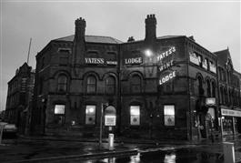 GB. England. Ashton-Under-Lyne. Yates's Wine Lodges. Although well priced in comparison to their competitors, these wine lodges acquired a distinctly dismal reputation with typical characteristics of a working class customer, elderly and often female with overdone make-up. But the unspoilt, original wine lodges, with their high ceilings and bare floorboards, their pillars and rails for propping yourself upright, seem clearly designed for the determined and joyless business of taking the quickest route to oblivion. Peter Yates insisted that, in the interests of sobriety, food should be available throughout licensing hours and every lodge still boasts “something good to eat at any time of the day†(though it maybe often no more than the ubiquitous pork pie!). 1983