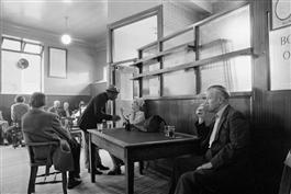 GB. England. Liverpool. Great Charlotte Street. Yates's Wine Lodges. Although well priced in comparison to their competitors, these wine lodges acquired a distinctly dismal reputation with typical characteristics of a working class customer, elderly and often female with overdone make-up. But the unspoilt, original wine lodges, with their high ceilings and bare floorboards, their pillars and rails for propping yourself upright, seem clearly designed for the determined and joyless business of taking the quickest route to oblivion. Peter Yates insisted that, in the interests of sobriety, food should be available throughout licensing hours and every lodge still boasts “something good to eat at any time of the day†(though it maybe often no more than the ubiquitous pork pie!). 1982