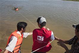A local is rescued from the river in a disaster training exercise supported by Oxfam. Oxfam works with local authorities to train communities on flood rescue, first aid, and strengthening homes, helping to minimise losses during floods and storms. 2009.