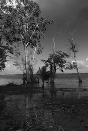 GUYANA. 2011. Tropical rainforest along the Essequibo river. Endangered mangrove, greenheart and mora trees covered in vines and epiphytes evade the loggers in Guyana's damp riverine forest.