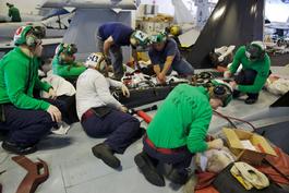 USA. American aircraft carrier USS George H W Bush. NImitz class. Nuclear powered with a crew of sailors and airmen of over 5,000. Somewhere in the Arabian Gulf. Maintainace of F-18 in the hangar.
