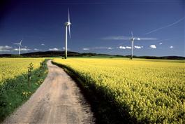 GERMANY. Near the Czech border south of Dresden. Oil-seed rape field with large windmills in the distance