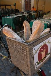 Italy. Rome. A man delivers fresh loaves of bread by bicycle to a restaurant. 2013