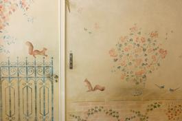 G.B. England. Balcombe. 2013. On the Greenwood Estate. Stencilled wallpaper in the Greenwood kitchen.