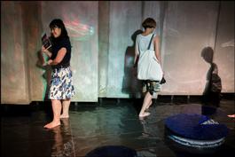 Singapore. Visitors to the Very Light Exhibition at the National Design Centre paddle outside the building after a monsoon shower. The exhibition is part of the Singapore Night Festival, August 2014. 2014