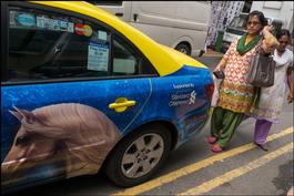 Singapore. Two local shoppers on the Serangoon Road in Little India negotiate the traffic on the road, here passing a taxi painted with a horse's head. 2014