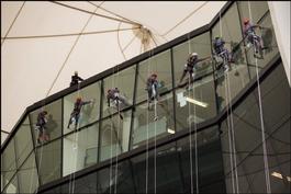 Singapore. Abseiling window cleaners on the Lasalle College of the Arts, McNally Street. 2014