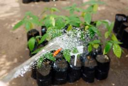 GHANA. Tafu. Cocoa Research Institute of Ghana. Watering seedlings. 2015.