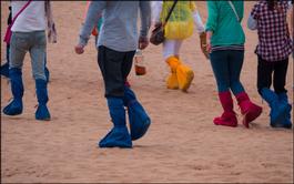 China. Mongolia. Xiangshawan is a holiday resort, Mongolian theme park on the edge of the Gobi desert for Chinese tourists. Holidaymakers from many countries prepare to climb the 45 degree slope of the sand dunes wearing special sand walking boots. 2013