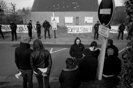FRANCE. Calais. 2014. Coulogne, two miles south of Calais. Police outside an abandoned house, now a squat where migrants are likely to be housed. Front Nationale and anti-migrant groups try to force the squat to close.