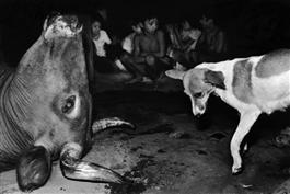 EL SALVADOR. A cow is slaughtered in the early morning at a refugee camp in El Salvador. The ÔcamesmosÕ who flee from the fighting in the countryside some times manage to bring some animals with them to the camps. They are a precious commodity and in the morning the meat will be sold to other refugees providing one of the few opportunities to eat meat. 1981.