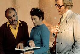 MOROCCO. FILM : The Man Who Would Be King. Sean Connery, Angela Allen (script lady) and Michael Caine go over the script before filming. 1975.