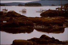 USA. Maine. Stonington. Small fishing boats moored after a...