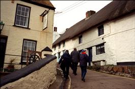 GB. England. Cornwall. Cadgwith. Thatched white houses line the narrow road of this Cornish fishing village built on a hill.