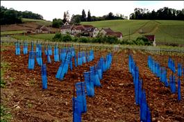 Europe. France. Champagne. Nr Boursault. Newly planted vines are protected by blue plastic during their early growth in a Champagne vineyard.