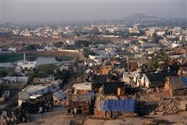 INDIA. Hyderabad. Early morning views over Hyderabad from the Jubilee Hills of new migrant arrivals to the city. Living in plastic tents perched along the Deccan Plateau, these people may return to the countryside after the construction projects in the area are finished. 2002.