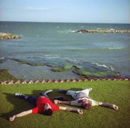 SPAIN. Barcelona. Commercial shoot for Barclays Bank. Gay couple rollerblading. 2002.