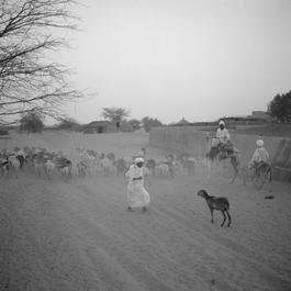 Sudan. A shepherd from the Maganin Tribe (Means crazy man in Arabic) with his flock of sheep, at the end of the day in the village of Mazrub. 1997.