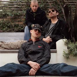 G.B. ENGLAND. London. The band Blur. Band members Damon ALBARN, Dave ROWNTREE, and Alex JAMES. Photographed in the garden of Damon ALBARN's house in Notting Hill. 2003.