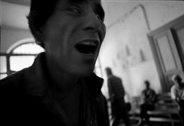 GREECE. Dodecanese islands. Leros. Inside the psychiatric hospital. Pavillon 11. Iorgos loves to sing and asks each care worker: "Give me a cigarette, but one with a letter on it". !994.