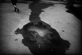AUSTRALIA. Sydney. A woman on her way to catch the Milsons Point ferry to the city walks past the face of Luna Park reflected in a puddle. From Dream/Life series. 1998.
