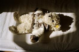 GB. ENGLAND. London. Teddy bear lying on a bed. 2001