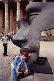 Europe. England UK. London. Bronze face by Japanese artist Tsuki-Hikari in the courtyard of the British Museum.