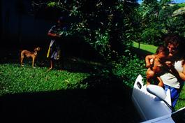 THE COOK ISLANDS. Rarotonga. Resident vet Dr.Jodi Salinsky is greeted by one of the islanders children as she makes a house call to remove stitches from a dog which was hit by a car. Dogs in Rarotonga, like feral dogs everywhere, live in a free-form state. There are no leashes. The dogs are not so much owned by someone as by everyone. February 2003.