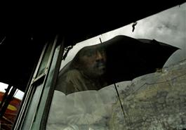 INDIA. Maharashtra region. Bombay. Truck driver inside his cabin looking at the monsoon rain. June 2002.