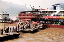 CHINA. Sichuan. Yunyang. A line of people queue to board the ferry which will take them over a thousand miles to Shanghai to escape their city which will be totally flooded on completion of theThree Gorges Dam. 2002.
