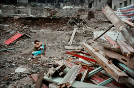 China. Sichuan. Wanxian. A woman sleeps in a chair near a temporary lean-to, on the site of her old property, in an area about to be flooded in the next phase of the Three Gorges Dam project.