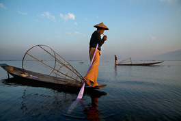 MYANMAR. Inle Lake. 2014. A fisherman lights his cigarette on...