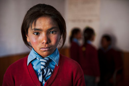 INDIA. Ladakh, 2008. Nomad child, Karma Tashi, in a boarding school classroom.